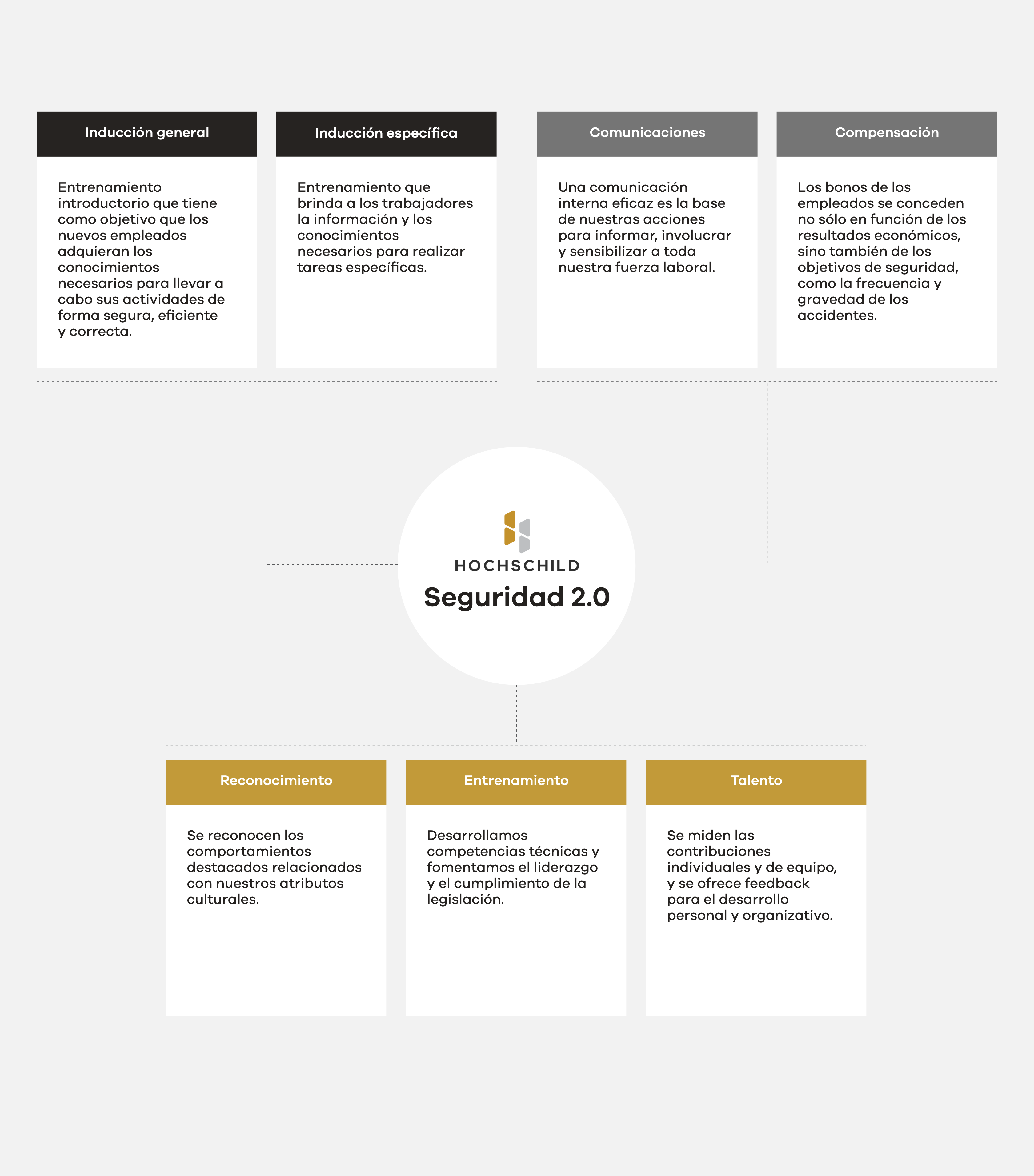 La gestión de los riesgos para la salud y la seguridad constituye el centro de nuestro enfoque en material de seguridad y está respaldada por nuestros Sistemas de Gestión de Seguridad y Salud Ocupacional. Este Sistema de gestión sigue las mejores prácticas, conforme a las prácticas internacionales reconocidas, y está certificado externamente para garantizar su cumplimiento en las unidades mineras.